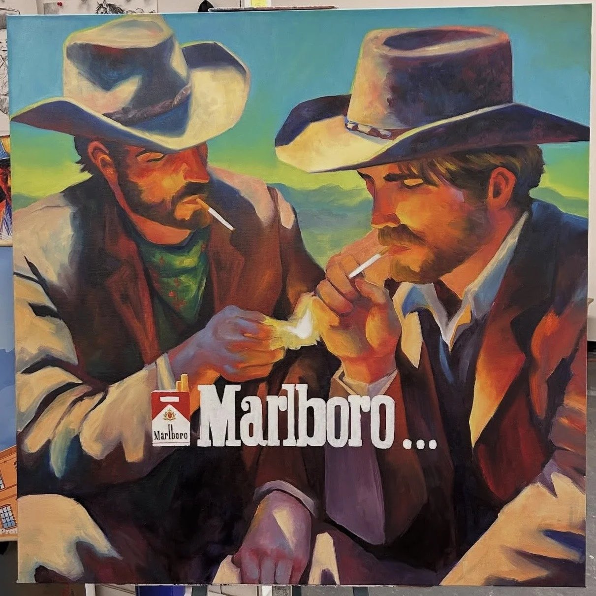 And here the risk sharpens: the cowboy is not only symbol. He is brand. When she paints him—even with nuance—she re-circulates the silhouette. Is repetition critique? Or reinforcement?