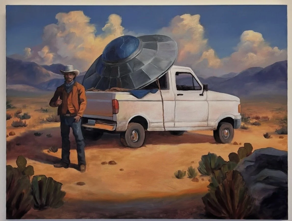 It’s January 2026. I return to Laura’s studio—not only to revisit that image but to examine what that waiting permits. Her work gathers three figures currently circulating through American anxiety: the cowboy, the alien, and the martyr. What looks like genre painting is not innocent. It is myth under pressure.